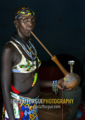 Woman Smoking A Waterpipe From Anuak Tribe In Traditional Clothing, Gambela, Ethiopia