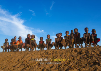 Dassanech tribe children dancing and jumping, Omo valley, Omorate, Ethiopia
