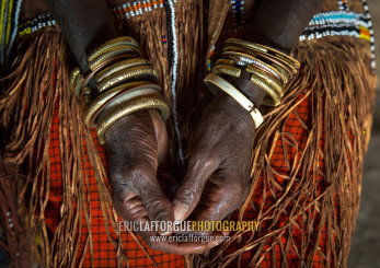 Tanzania, Serengeti Plateau, Lake Eyasi, the numerous decorated iron, brass, copper and leather bracelets worn by a datoga woman