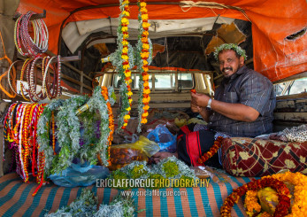 A flower vendor preparing floral garlands and crowns on a market in the back of his car, Jizan Province, Addayer, Saudi Arabia
