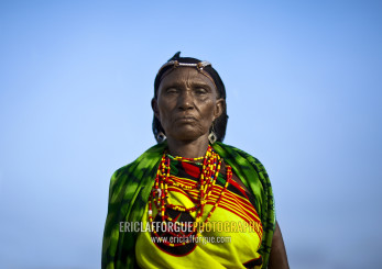 Portrait of a Gabra tribe woman with colorful veil, Marsabit County, Chalbi Desert, Kenya