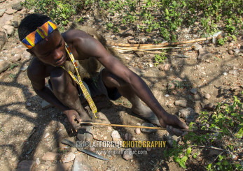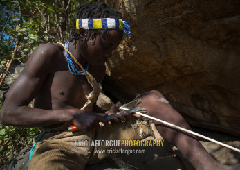 Tanzania, Serengeti Plateau, Lake Eyasi, hadzabe bushman making the arrow for a hunting bow