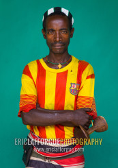 Portrait of a Hamer tribe man wearing a barcelona football shirt, Omo valley, Dimeka, Ethiopia