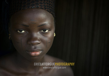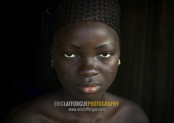Benin, West Africa, Onigbolo Isaba, holi tribe woman covered with traditional facial tattoos and scars portrait