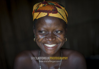 Benin, West Africa, Onigbolo Isaba, smiling holi tribe woman covered with traditional facial tattoos and scars