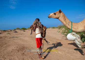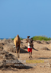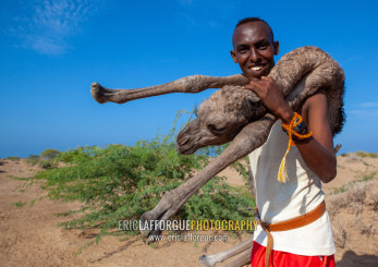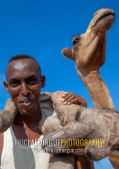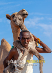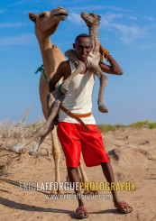 A somali man is holding a new born baby camel on his back, Awdal region, Lughaya, Somaliland