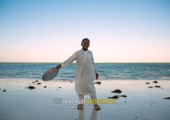 Tanzania, Zanzibar, Kizimkazi, young muslim boy in school uniform on beach