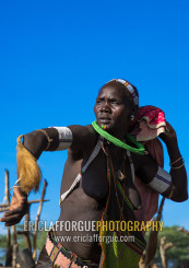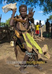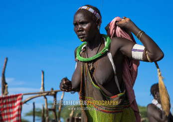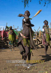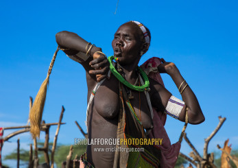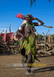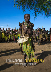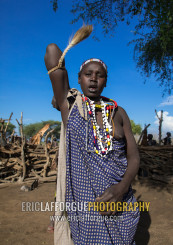 Toposa tribe woman in traditional clothing dancing during a ceremony, Namorunyang State, Kapoeta, South Sudan
