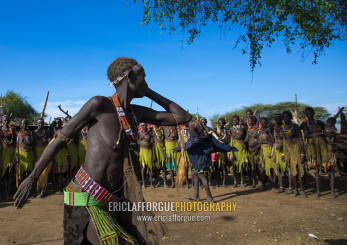 Toposa tribe woman in traditional clothing dancing during a ceremony, Namorunyang State, Kapoeta, South Sudan