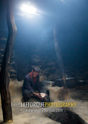 Wakhi teenage boy preparing salty milk tea inside his house, Big pamir, Wakhan, Afghanistan
