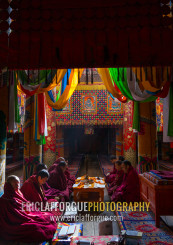 Monks praying and meditating inside Rongwo monastery, Tongren County, Longwu, China