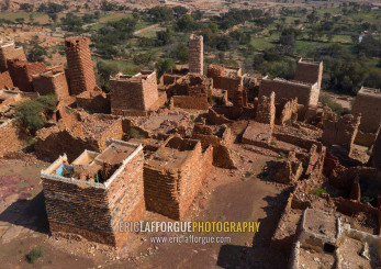 Aerial view of red stone and mud houses with slates in a village, Asir province, Sarat Abidah, Saudi Arabia