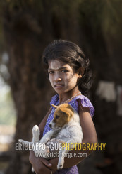 Girl With Thanaka On Cheeks Carrying A Dog, Ngapali, Myanmar