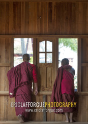 Novices Monks Looking Thru A Window, Inle Lake, Myanmar