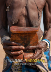 Muhacaona tribe woman holding an old headrest, Cunene Province, Oncocua, Angola