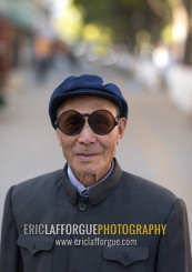 Old man with traditional sunglasses and cap, Gansu province, Linxia, China