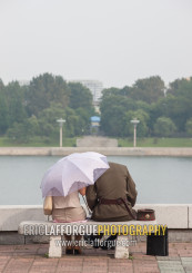 A North Korean soldier with his wife sitting on a bench, Pyongan Province, Pyongyang, North Korea