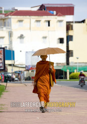 Cambodian monk walking in the street with umbrella, Phnom Penh province, Phnom Penh, Cambodia