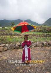 Boy collecting money in an umbrella to build a new church, Semien wollo zone, Woldia, Ethiopia