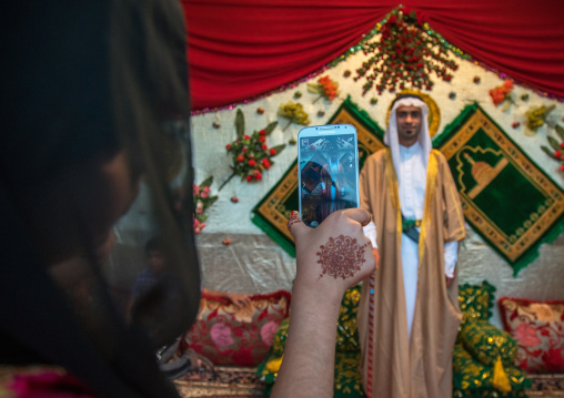 groom posing for a mobile phone picture with his new traditional clothes during a wedding ceremony, Hormozgan, Bandar-e Kong, Iran