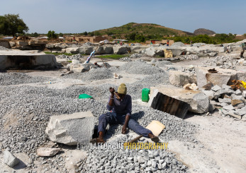 African woman crashing stones in a granite quarry, Savanes district, Shienlow, Ivory Coast