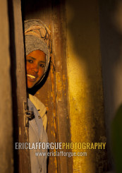 Smiling eritrean woman standing in a door, Central Region, Asmara, Eritrea