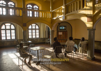 Eritrean men looking at television inside Opera house bar, Central Region, Asmara, Eritrea