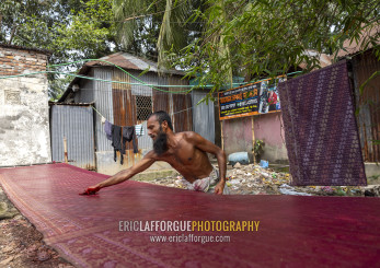 Bangladeshi man putting wax on fabric, Dhaka Division, Rupganj, Bangladesh