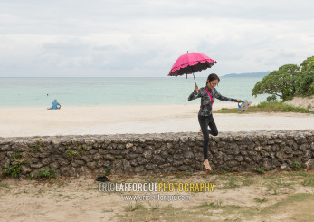 Japanese woman with an umbrella in kondoi beach, Yaeyama Islands, Taketomi island, Japan