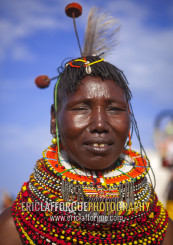 Turkana tribe woman with huge necklaces and ear rings, Turkana lake, Loiyangalani, Kenya
