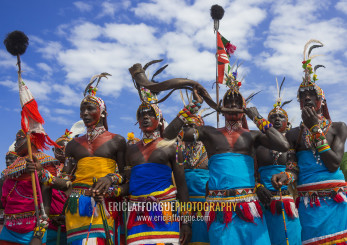 Rendille tribesmen blowing in a horn, Turkana lake, Loiyangalani, Kenya