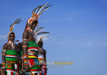Portrait of rendille warriors wearing traditional headwears, Turkana lake, Loiyangalani, Kenya