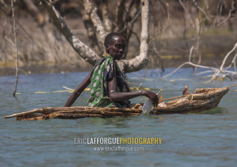 Old woman on a traditional boat rowing, Baringo county, Baringo, Kenya