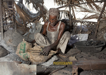 Blacksmith sweating while he forges nails, Lamu County, Lamu, Kenya