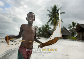 Young boy playing with a dhow boat model, Lamu County, Lamu, Kenya