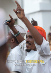Sunni muslim men celebrating the maulidi festivities in the street, Lamu county, Lamu town, Kenya