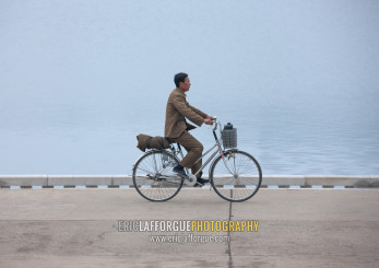 North Korean man riding a bicycle along Taedong river, Pyongan Province, Pyongyang, North Korea