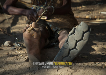 Tanzania, Serengeti Plateau, Lake Eyasi, hadzabe tribe man shoes made from a car tyre