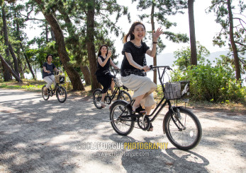 Japanese women riding bicycles in Amanohashidate, Kyoto Prefecture, Miyazu, Japan
