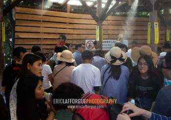 Tourists in gensen kakenagashi footbath area in Kamado jigoku, Oita Prefecture, Beppu, Japan