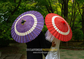 Japanese couple with umbrellas in the botanic garden, Kansai region, Kyoto, Japan
