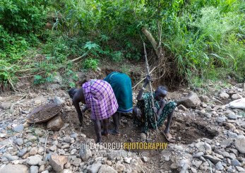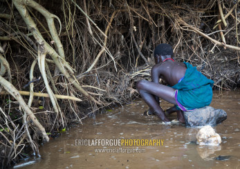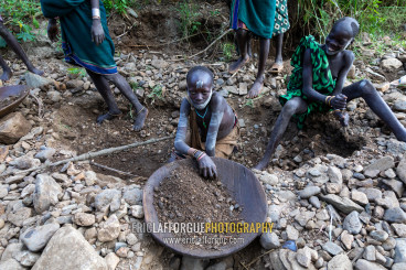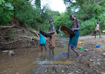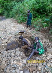 Suri tribe girls doing gold panning in a river, Omo valley, Kibish, Ethiopia