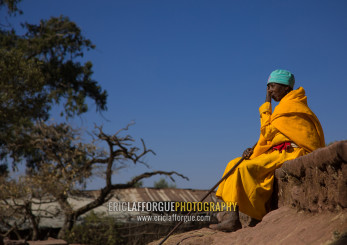 Lonely ethiopian monk woman in yellow shawl, Amhara Region, Lalibela, Ethiopia