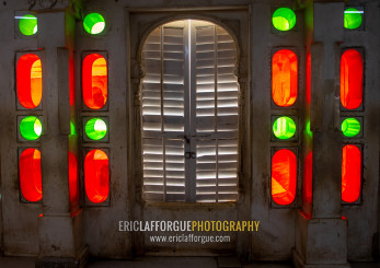 Multi coloured stained glass windows in the city palace, Rajasthan, Udaipur, India
