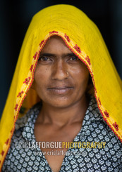 Portrait of a rajasthani woman in traditional yellow sari, Rajasthan, Baswa, India
