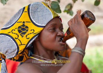 Mucubal tribe woman drinking a beer, Namibe Province, Virei, Angola