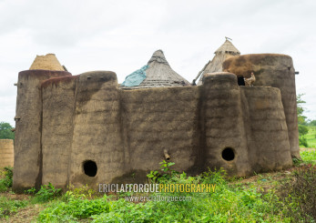Togo, West Africa, Nadoba, traditional tata somba house with thatched roofs and granaries