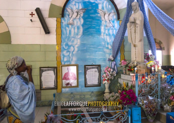 Benin, West Africa, Cotonou, woman praying inside the notre dame roman catholic cathedral