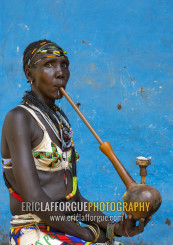Woman Smoking A Waterpipe From Anuak Tribe In Traditional Clothing, Gambela, Ethiopia