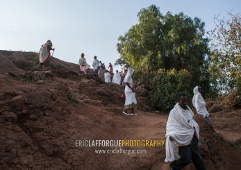 Ethiopian people walking along a hill, Amhara region, Lalibela, Ethiopia